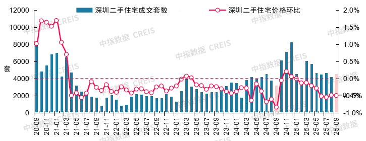 图:2020年9月至2025年9月深圳二手住宅成交套数及二手住宅价格环比走势