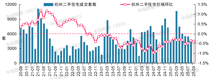 图:2020年9月至2025年9月杭州二手住宅成交套数及二手住宅价格环比走势