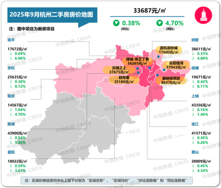 图:2025年9月杭州各市辖区二手住宅挂牌均价及同环比