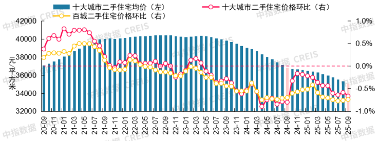 根据中国房地产指数系统百城价格指数,2025年9月,百城二手住宅均价环比下跌0.74%,同比下跌7.38%;十大城市二手住宅均价环比下跌0.67%,较8月略有扩大,同比下跌4.77%。
