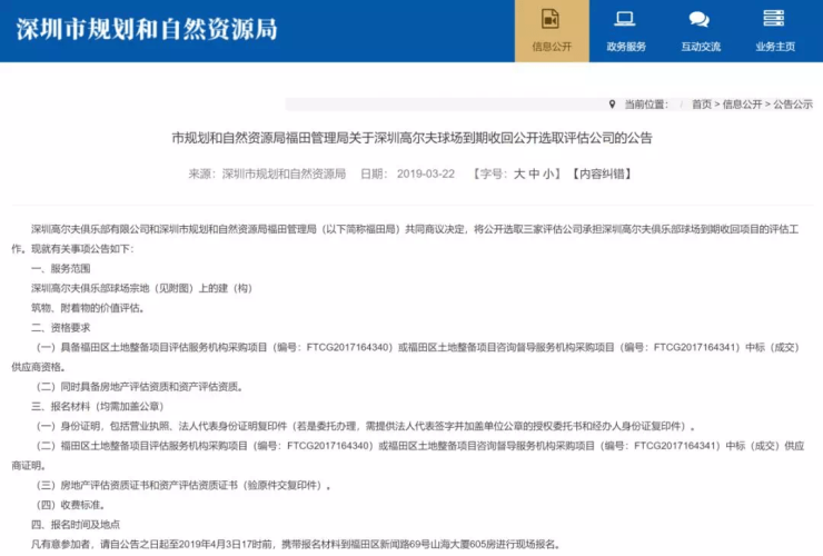 2019年3月,深圳市规划和自然资源局发布公告,选取评估公司承担深圳高尔夫俱乐部球场到期收回项目的评估工作,对球场宗地上的建(构)筑物、附着物进行价值评估。
