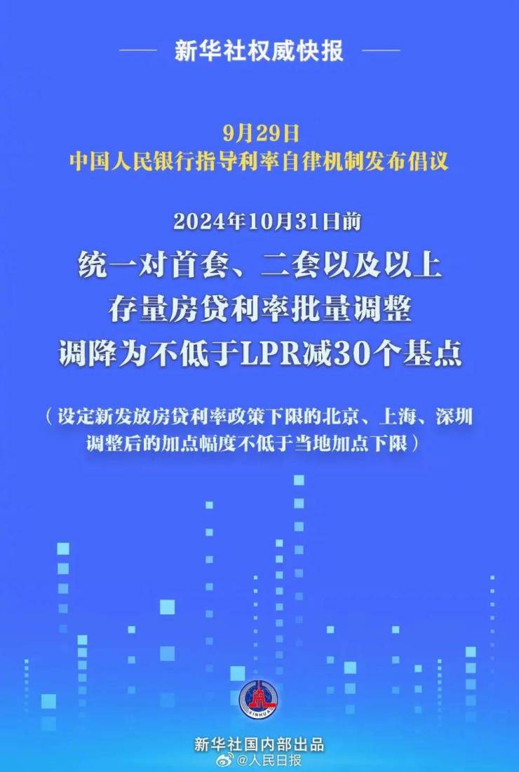 中国人民银行今天发布公告,完善商业性个人住房贷款利率定价机制,允许满足一定条件的存量房贷重新约定加点幅度,促进降低存量房贷利率。市场利率定价自律机制同时发布倡议,各家商业银行原则上应在2024年10月31日前对符合条件的存量房贷开展批量调整。对于加点幅度高于-30基点的存量房贷利率,将统一调整到不低于-30个基点,且不低于所在城市目前执行的新发放房贷加点下限(如有),使得利率水平靠近全国新发放房贷利率附近,预计平均降幅0.5个百分点左右。