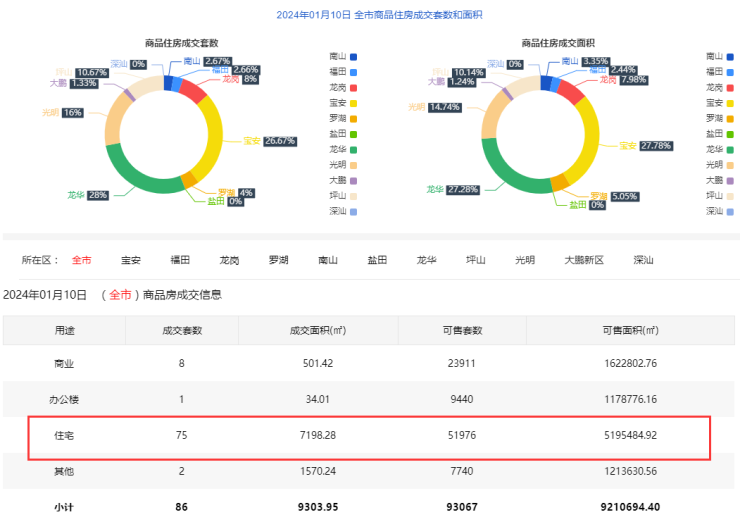 2024年1月10日新房住宅共网签75套。宝安20套;福田2套;龙岗6套;罗湖3套;南山2套;盐田0套;龙华21套;坪山8套;光明12套;大鹏1套;深汕0套。