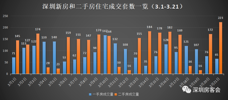 2023年3月1日-3月21日,深圳市新房住宅共成交2046套,二手房住宅共成交2647套,日成交量见图示。