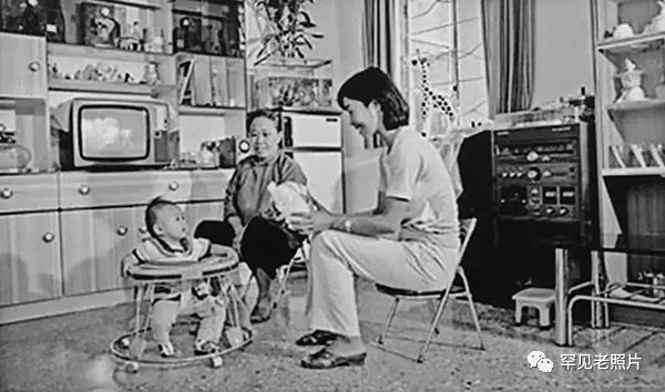 1980年代初,深圳市罗湖区渔民村村民邓锦辉家。图为邓锦辉的妻子、大儿子,以及家中保姆。