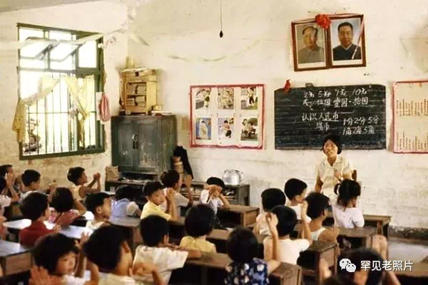 1980年,深圳市某小学教室,黑板上方是毛主席和华国锋的照片。出目里利吕井(日)/摄。