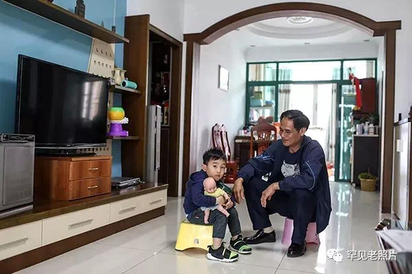 2018年3月,邓锦辉和小孙子在家中。