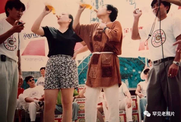 1986年,深圳两位女士参加喝金威啤酒比赛活动。