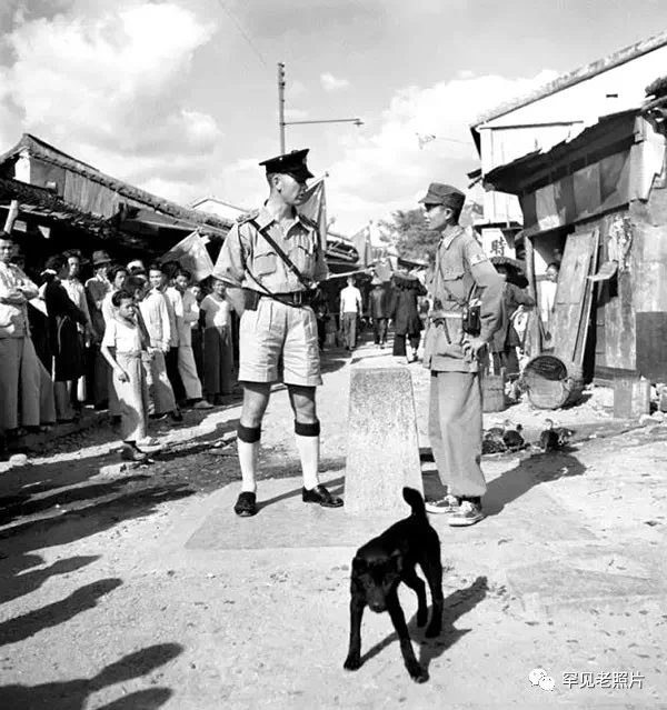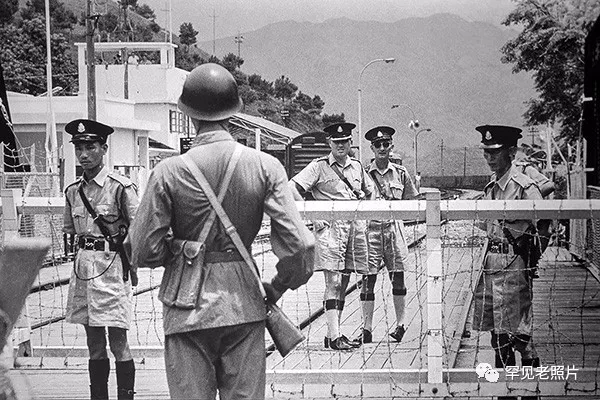 1949年,深圳中英街,英国士兵和共产党的士兵在界碑两侧对视。