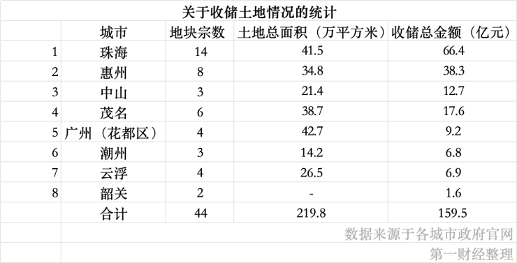 据第一财经不完全统计,广东省目前共有8个城市发布了首批土地收储公告,涉及的土地共44宗,土地总面积约219.8万平方米,收储总金额约159.5亿元,土地用途包括二类居住、商务、商业、办公、旅游等。