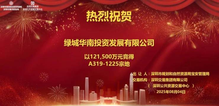 8月4日下午3点,宝安新桥A319-1225宗地正式出让,本次共有4家房企参与竞拍,最终经过29轮报价,绿城以12.15亿将该宗宅地收入囊中。