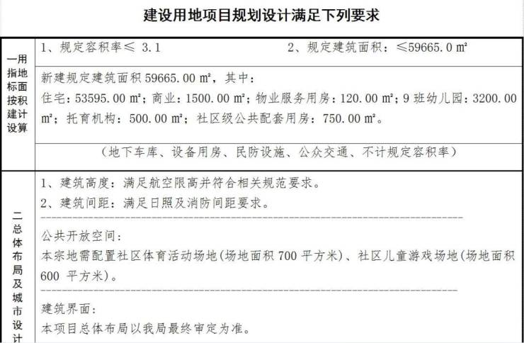 该宗地土地面积19246.94㎡,规定容积率≤3.1,建筑面积59665㎡,包括53595㎡住宅,1500㎡商业,住宅和商业允许分割转让;另有还规划有3200㎡9班幼儿园,以及500㎡托育机构等。