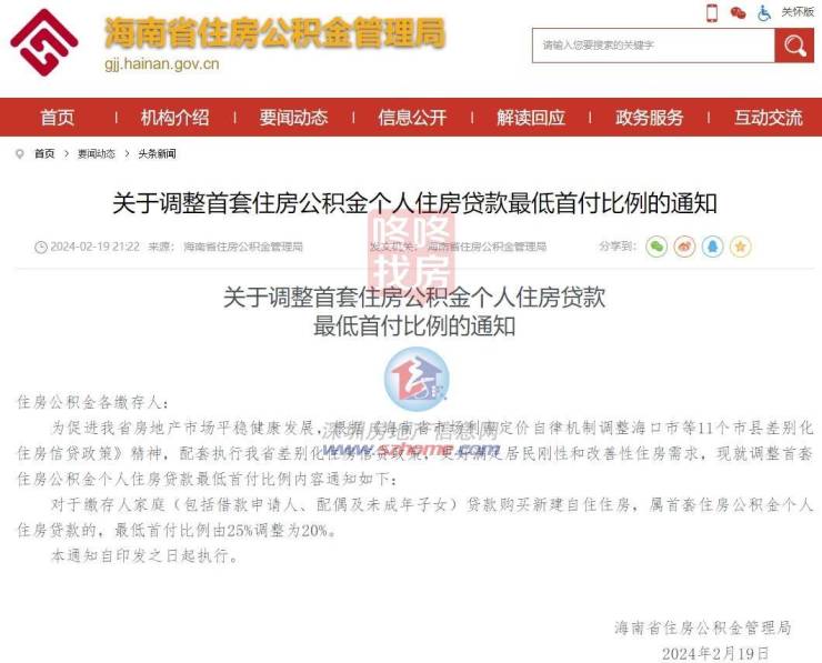 2月19日,海南省住房公积金管理局印发《关于调整住房公积金首套个人住房贷款最低首付比例的通知》(以下简称《通知》),将首套住房公积金个人住房贷款最低首付比例由25%下调至20%。