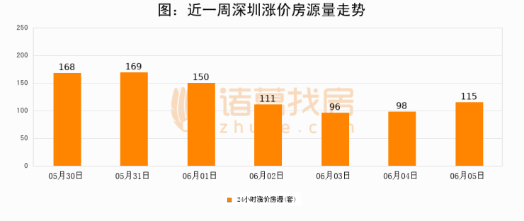 根据诸葛找房数据显示,深圳24小时涨价房源量为115套,较06月04日增加17套,环比上涨17.3%。与此同时,涨价房源占比小幅扩大,业主信心有所提升。