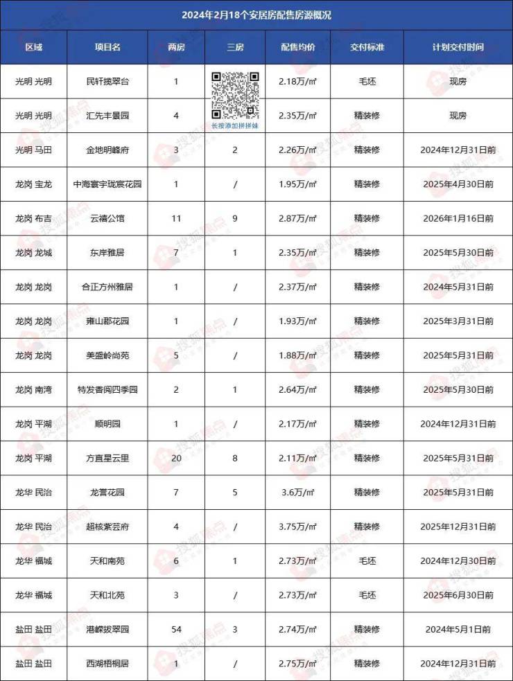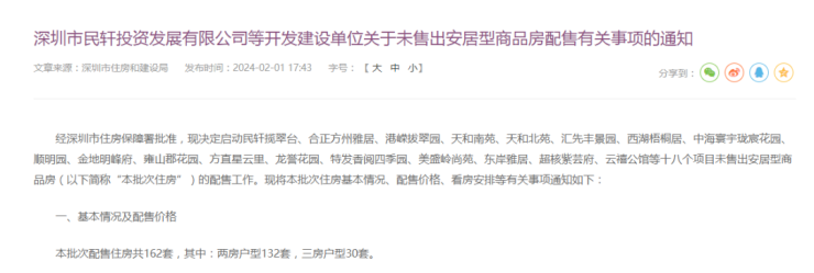 2月1日,深圳住建局发布通告、通知,启动民轩揽翠台、合正方州雅居、港嵘拔翠园、天和南苑、天和北苑、汇先丰景园、西湖梧桐居、中海寰宇珑宸花园、顺明园、金地明峰府、雍山郡花园、方直星云里、龙誉花园、特发香阅四季园、美盛岭尚苑、东岸雅居、超核紫芸府、云禧公馆等十八个项目未售出安居型商品房的配售。