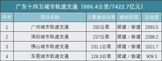 城市轨道交通涉及4个城市(广州、深圳、佛山、东莞)共886.4公里,总投资7422.7亿元;