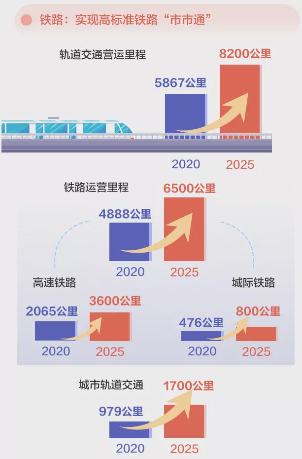 发力轨道交通建设,加快实现粤港澳大湾区互联互通成为此次规划的一大重点。“十四五”期间,广东轨道交通运营里程将由5867公里提升至8200公里。其中,铁路运营里程由4888公里提升至6500公里,城市轨道交通里程由979公里提升至1700公里...详情如下: