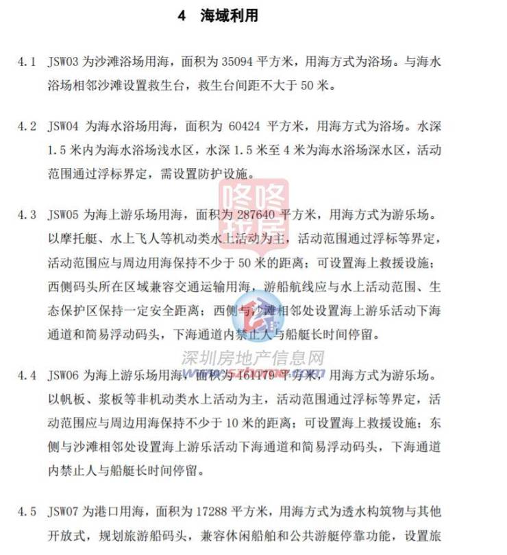 JSW04为海水浴场用海,面积为 60424 平方米,用海方式为浴场。水深1.5 米内为海水浴场浅水区,水深 1.5 米至4米为海水浴场深水区,活动范围通过浮标界定,需设置防护设施。
