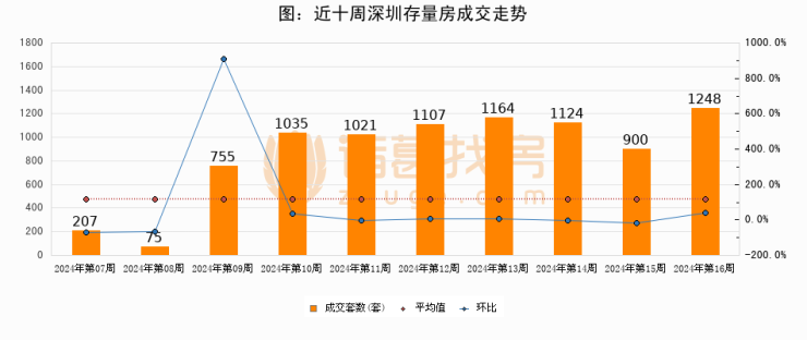 存量房方面,第15周深圳存量房成交1248套,较上周增加348套,环比上涨38.7%。从近十周成交走势来看,周均成交套数为863套,本周高于平均水平44.6%。