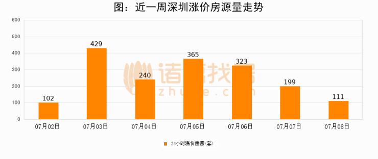 根据诸葛找房数据显示,深圳24小时涨价房源量为111套,较07月07日减少88套,环比下降44.2%。与此同时,涨价房源占比小幅回落,对于购房者来说是一个入市窗口期,购房者可抓住时机入市。