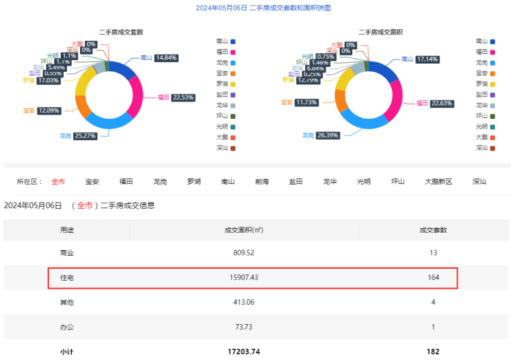 2024年5月6日二手房住宅网签164套。宝安21套;福田35套;龙岗40套;罗湖28套;南山26套;盐田1套;龙华10套;光明1套;坪山2套;大鹏0套。
