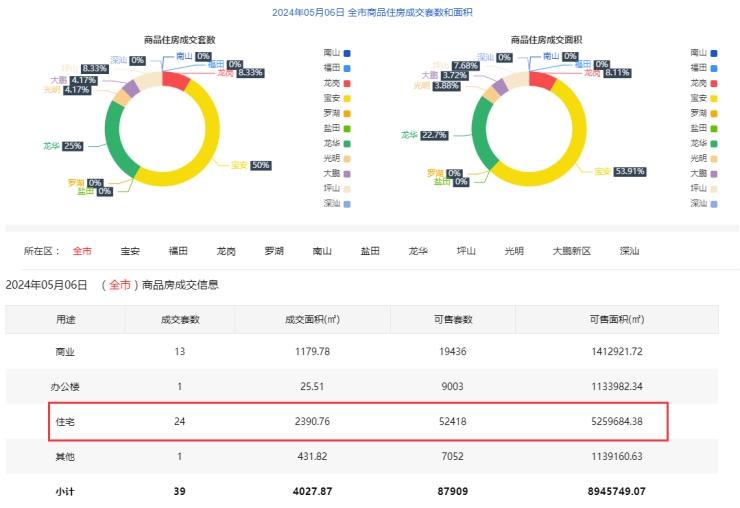 2024年5月6日新房住宅共网签24套。宝安12套;福田0套;龙岗2套;罗湖0套;南山0套;盐田0套;龙华6套;坪山2套;光明1套;大鹏1套;深汕0套。