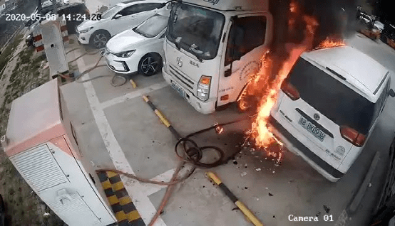 为此,我们查询了电动汽车充电造成火灾情况。发现在停车场充电的新能源汽车引发火灾案例不少。据紧邻深圳的东莞消防报道,2020年5月8日14时24分左右,一辆新能源汽车停放在充电站内,充电枪与车辆处于连接状态,旁边密集地停放着多辆新能源汽车正在充电。视频中初期,先是听到一些异响,随即右方白色小车双闪灯亮起,紧接着车辆底盘开始冒烟。