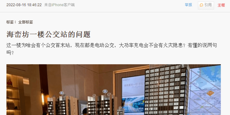 实际上,海峦坊缺点也不少,这不我们就找到客户吐槽海峦坊的缺点之一就是项目一楼有公交首末站。这个问题较严重,要知道楼下就是公交站,对于单价8万+的住宅楼盘而言,至少算得上“豪刚”住宅盘,动辄数百万起步,公交站带来的客户噪声、空气污染肯定比规划园林或者商铺多,电动汽车更有网友所说的充电带来的潜在火灾隐患。