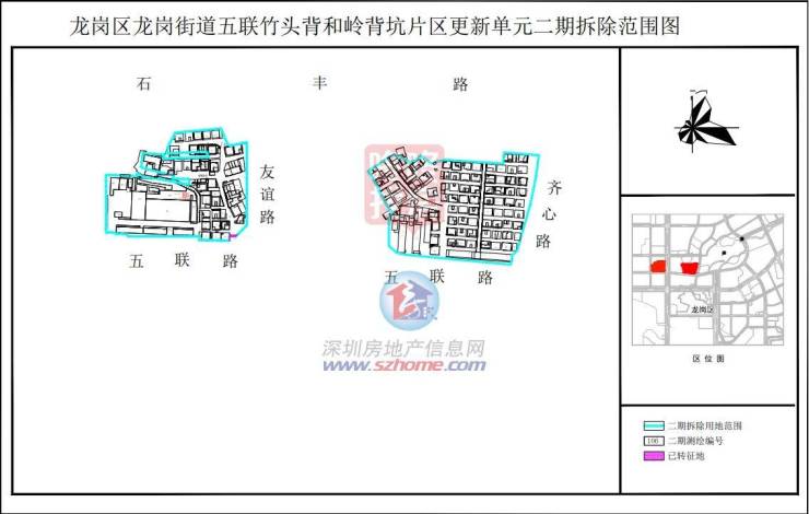 龙岗区龙岗街道五联竹头背和岭背坑片区更新单元二期位于五联路和友谊路交会处。