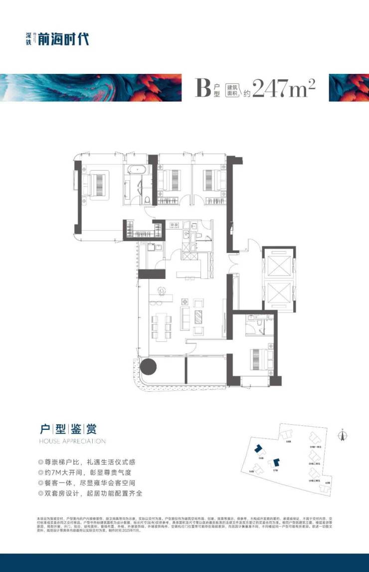 主推产品户型图如下,主打满分奢阔舒居。深铁前海时代尊府小区为纯粹大户型产品,小区业主圈层也比较纯粹。