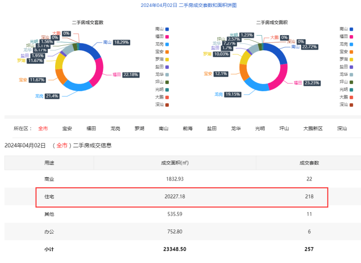 2024年4月2日二手房住宅网签218套。宝安28套;福田52套;龙岗48套;罗湖27套;南山39套;盐田6套;龙华15套;光明2套;坪山7套;大鹏2套。