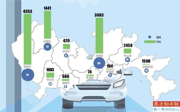 宝安区新规划的路边停车泊位最多,达到了4353个,覆盖了福海、福永、航城、沙井、松岗、新安、燕罗等7个街道共56条道路,其中仅沙井街道就计划在18条道路上新增设置泊位1485个;松岗街道12条道路拟设置泊位943个;