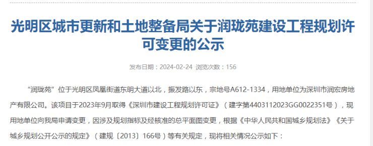 光明区城市更新和土地整备局则在近期公示了关于润珑苑建设工程规划许可变更的信息,变更内容包括场地设计、建筑设计、调整人防楼梯、雨棚、非机动车车位布局等细部设计及相关经济指标调整。