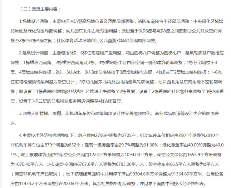 其中包括,总户数减少:由2796户调整为2705户;机动车停车位减少:由2901个调整为2810个;部分楼栋户型调整:5栋、6栋住宅塔楼由四梯八户调整为四梯七户;部分公共面积调整:地上核增建筑面积中架空公众休闲由1224㎡调整为1094㎡等。