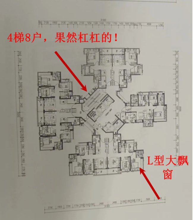 目前项目户型图尚未公示,部分楼栋的楼层平面图已经流出,从平面图上可看到户型设计上“重用”了飘窗,一定程度上保证了户型的采光通透性和户型的实际使用空间。