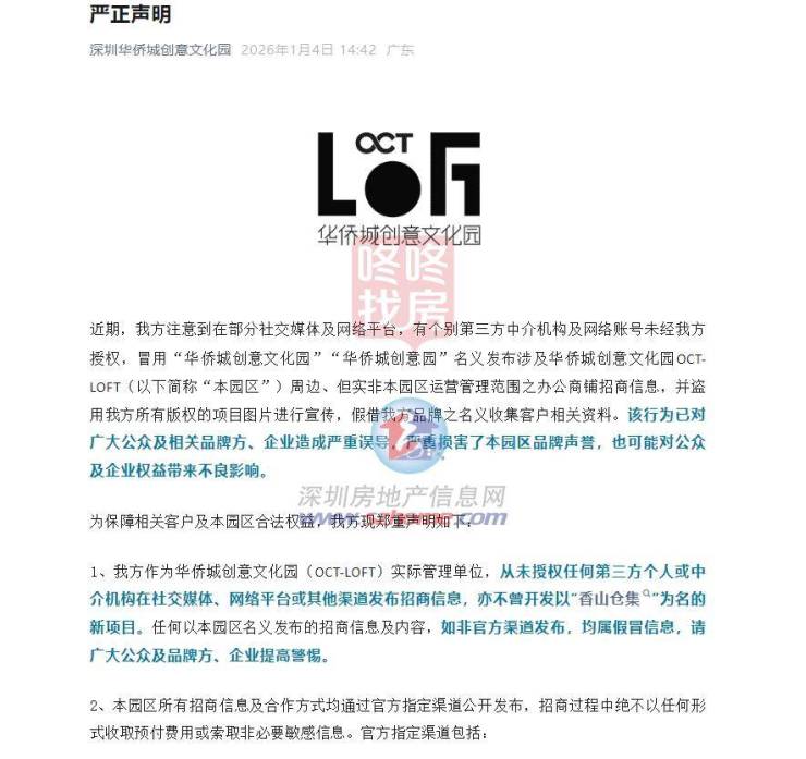 声明称,近期,在部分社交媒体及网络平台,有个别第三方中介机构及网络账号未经授权,冒用“华侨城创意文化园”“华侨城创意园”名义发布涉及华侨城创意文化园OCT-LOFT(以下简称“本园区”)周边、但实非本园区运营管理范围之办公商铺招商信息,并盗用该园区所有版权的项目图片进行宣传,假借该公司品牌之名义收集客户相关资料。