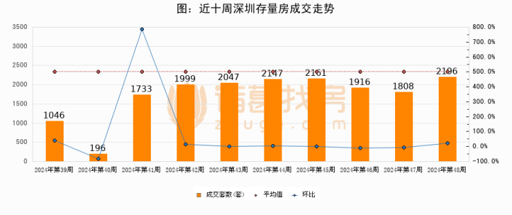 存量房方面,第48周深圳存量房成交2196套,较上周增加388套,环比上涨21.5%。从近十周成交走势来看,周均成交套数为1724套,本周高于平均水平27.4%。