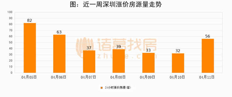 根据诸葛找房数据显示,深圳24小时涨价房源量为56套,较04月10日增加24套,环比上涨75%。与此同时,涨价房源占比小幅扩大,业主信心有所提升。