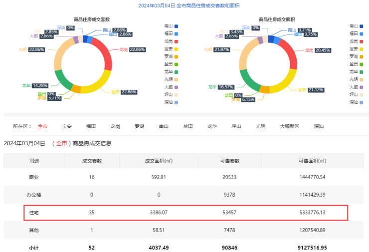 2024年3月4日新房住宅共网签35套。宝安8套;福田1套;龙岗8 套;罗湖2套;南山1套;盐田0套;龙华5套;坪山1套;光明8套;大鹏1套;深汕0套。