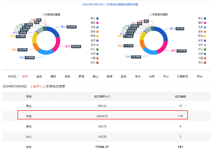 2024年3月4日二手房住宅网签174套。宝安19套;福田33套;龙岗37套;罗湖25套;南山37套;盐田1套;龙华15套;光明2套;坪山5套;大鹏1套。