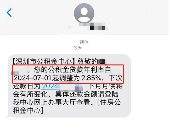 有存量房公积金网友已经收到深圳市公积金中心的利率调整通知,通知表示,2024年7月1日起调整为2.85%,下月月供将有所变化。
