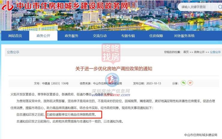 10月13日,中山市住房和城乡建设局发布《关于进一步优化房地产调控政策的通知》,通知宣布石岐街道暂停实行商品住房限购政策。