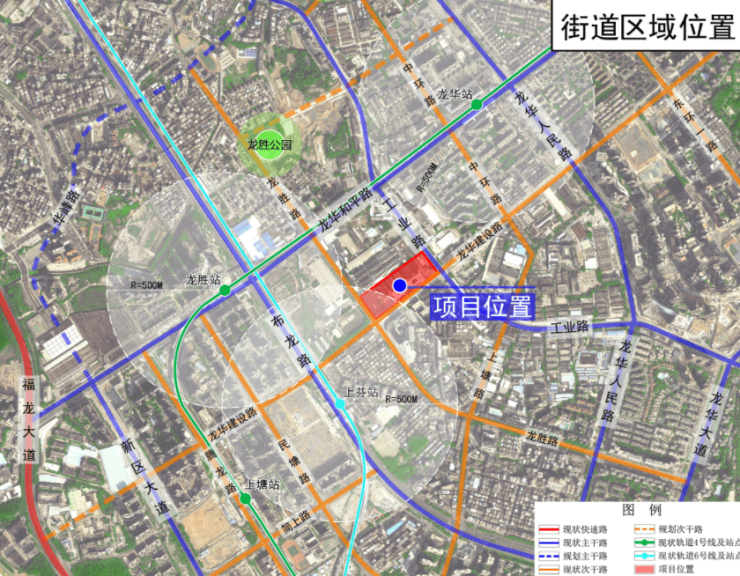项目位于龙华区中央活力区的龙华超级商圈,紧邻龙澜智造走廊,位于三轨道辐射区域,区位条件优越。西侧紧邻城市次干道龙胜路,南侧紧邻城市次干道龙华建设路,东侧紧邻城市主干道工业路,位于轨道6号线上芬站,轨道4号线龙胜站、龙华站三个轨道站点500-800米辐射范围。