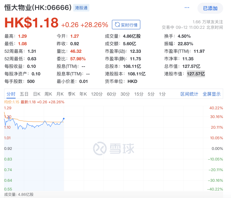 在历经短暂停牌后,9月12日,恒大物业(06666.HK)复牌高开超38%。随后股价出现回调,截至发稿,报1.18港元,涨幅约28.26%,总市值约127.57亿港元。