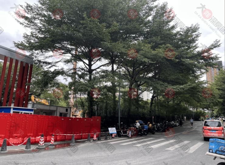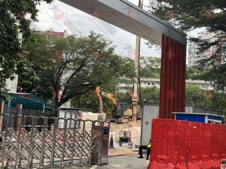 目前地块已经用围挡围起来,挖掘机已经完成土地平整,但地基还没开挖,项目刚好处在花园路的上坡路段。