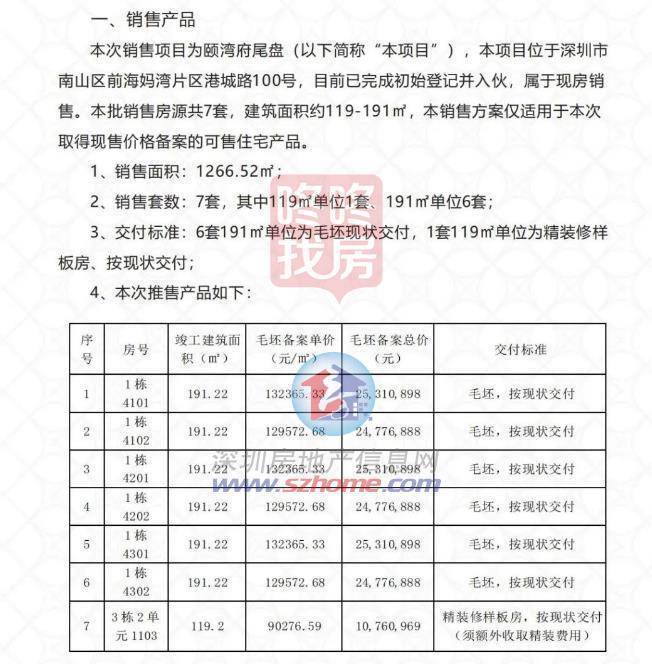 10月31日,前海颐湾府尾盘销售方案发布,共有7套住宅,其中119平米单位1套(精装样板房),191平的单位6套(毛坯交付)。