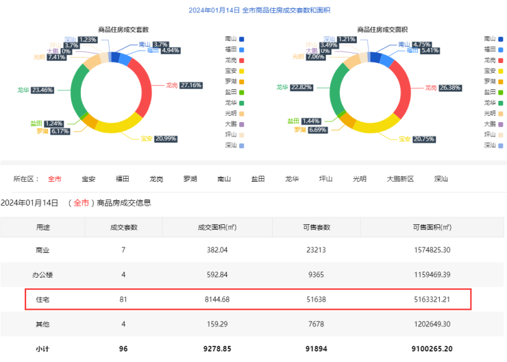 2024年1月14日新房住宅共网签81套。宝安17套;福田4套;龙岗22套;罗湖5套;南山3套;盐田1套;龙华19套;坪山3套;光明6 套;大鹏0套;深汕1套。