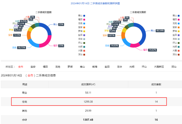 2024年1月14日二手房住宅网签14套。宝安1套;福田3套;龙岗3套;罗湖1套;南山4套;盐田0套;龙华0套;光明1套;坪山1套;大鹏0套。