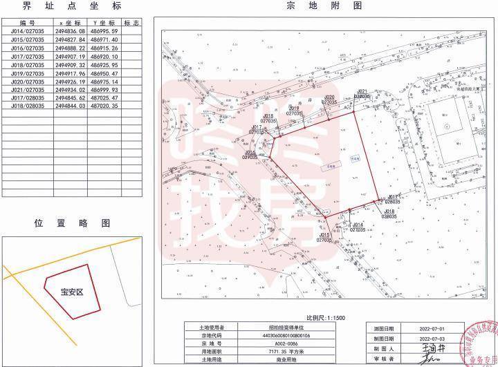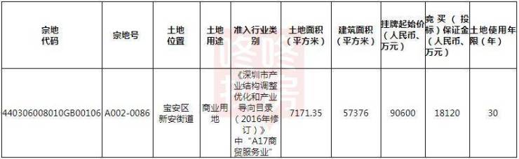 宗地号A002-0086,土地位置宝安区新安街道,土地用途商业用地,准入行业类别《深圳市产业结构调整优化和产业导向目录(2016年修订)》中“A17商贸服务业”,土地面积7171.35平方米,建筑面积57376平方米,挂牌起始价90600万元,土地使用年限30年。