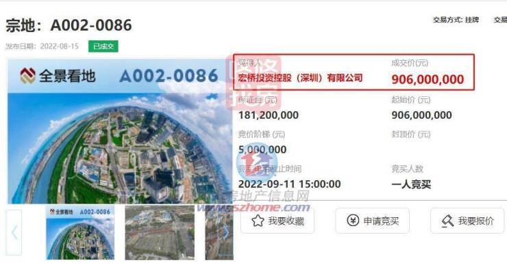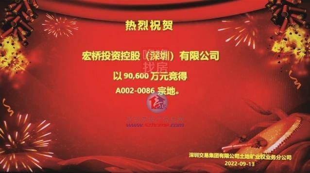 9月13日,宏桥投资控股(深圳)有限公司(以下简称“宏桥投资”)以9.06亿元竞得宝安商业用地(A002-0086),该地块将用于建设商贸服务业企业总部。